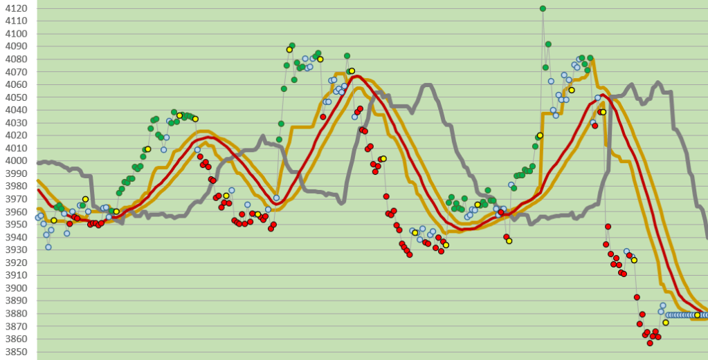 Below, is our more recent visual system. The brick red line is the 29 bar moving average of the close. The Gray colored line is the Span A of conventional Ichimoku calculation. We have found it to be helpful in confirming the Trend, which gives us “permission” to enter in a trade direction, either long or short.