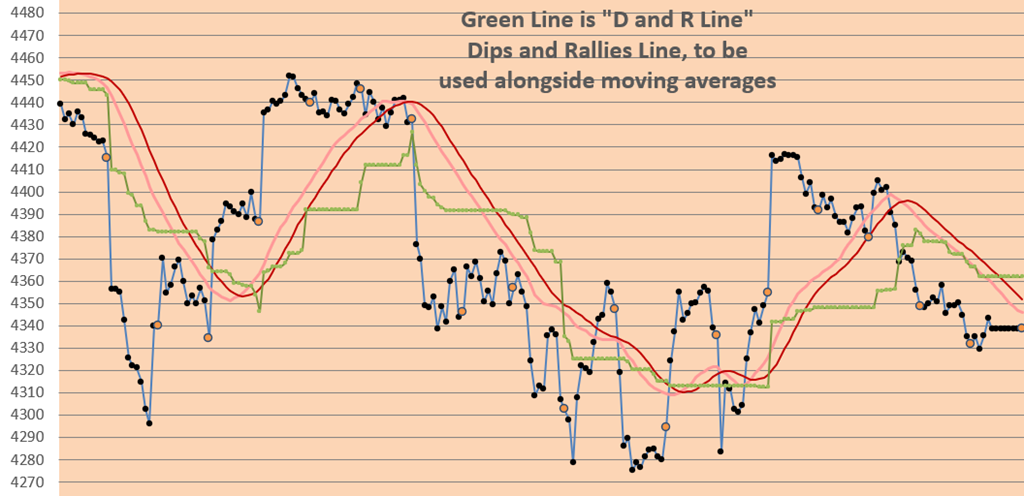 This technical indicator (shown in GREEN below) is based upon recent dips in prices and/or recent rallies in prices. It is the halfway line between the 3 day high price line (not shown) and the 3 day low price line (not shown). A 29 bar s.m.a. of closes is shown, and a smoothed 29 bar s.m.a. of closes is shown along side the GREEN line. They look like this: