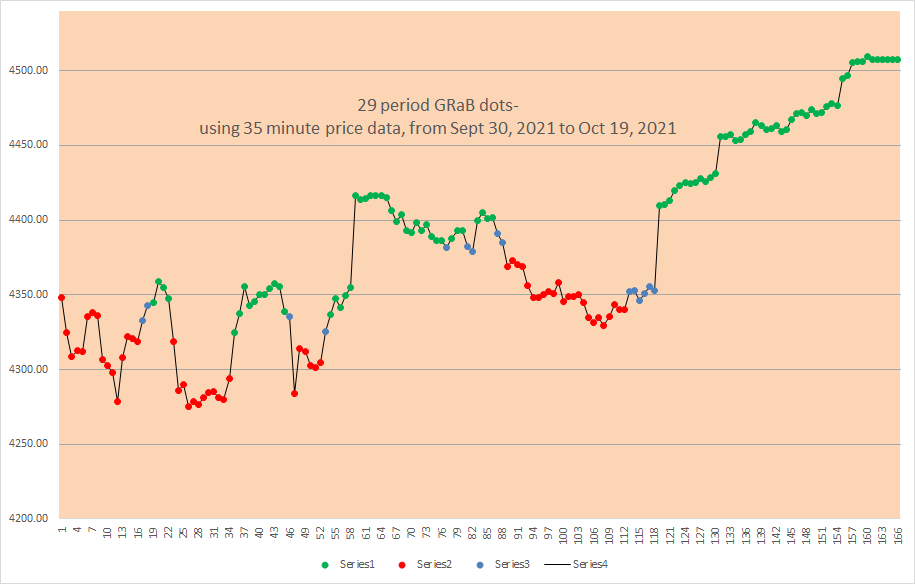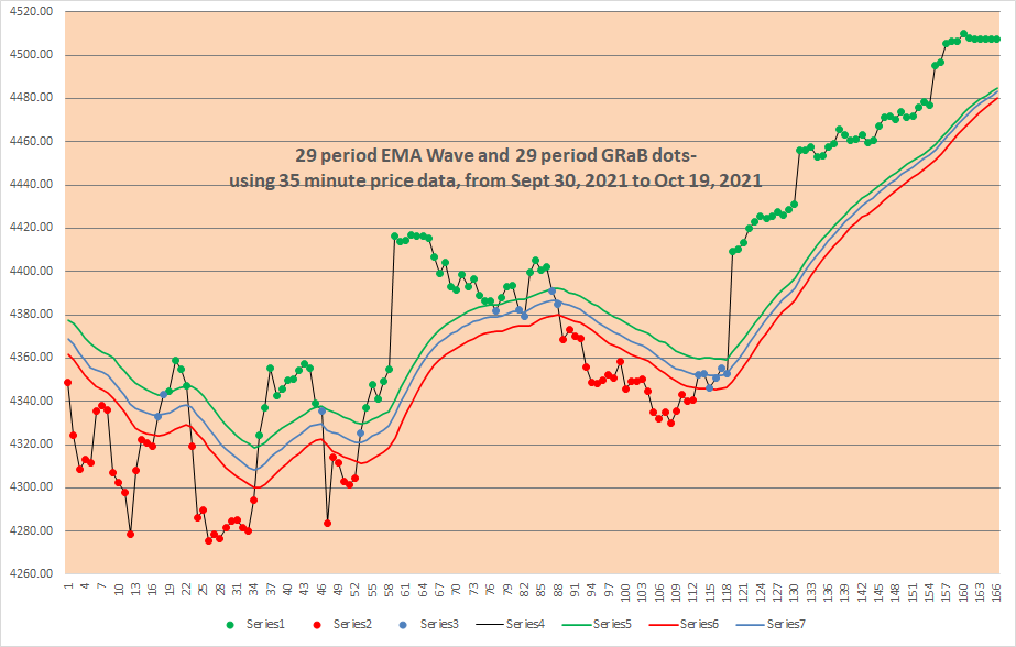 FIRST, CONVERT EACH PRICE POINT (the 35 minute closing prices) INTO A COLOR DOT, BASED UPON above the EMA lines, below the EMA lines, or between the EMA lines. Here are the color dots, green, red, blue: