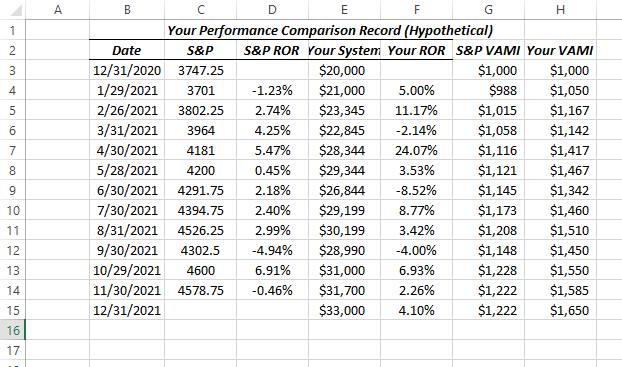 VALUE ADDED MONTHLY INDEX (VAMI) (When to Use it?): When you have different trading systems and you want to compare their performance, or if you have different versions of one system and you want to compare them, it is useful to normalize the monthly returns and then compare them with VAMI calculations. Or, you can compare your results on a monthly basis with the performance of the emini S&P (or any other tradeable).